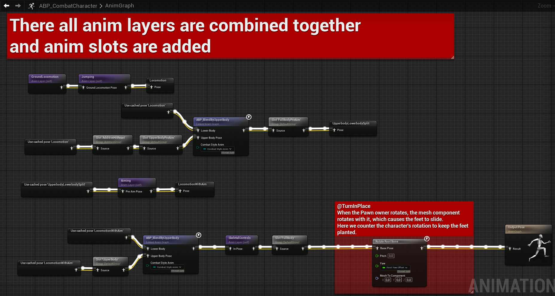 Then all layers are combined together in Anim Graph where also animation slots are added for animation montages.