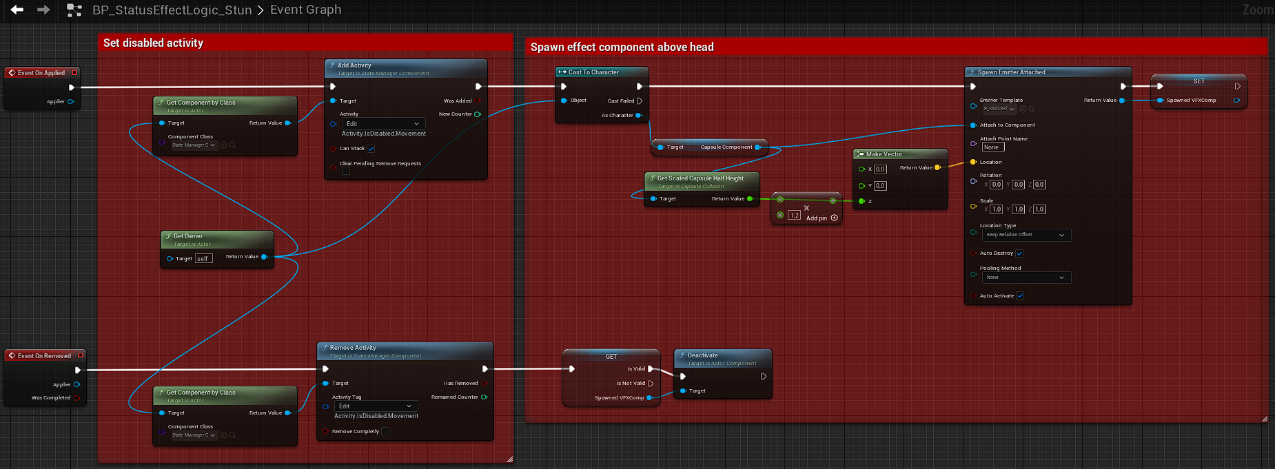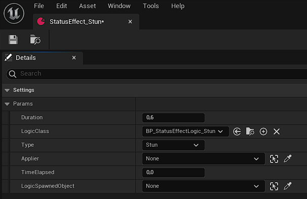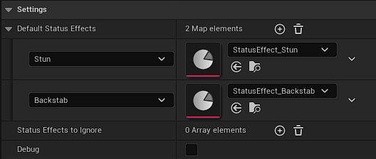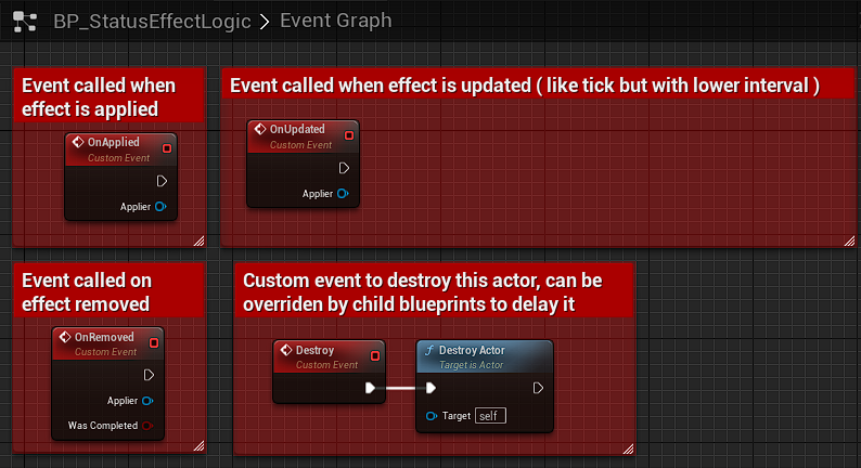 Each status effect can have its own logic class based on BP_StatusEffectLogic with logic on applied / removed.