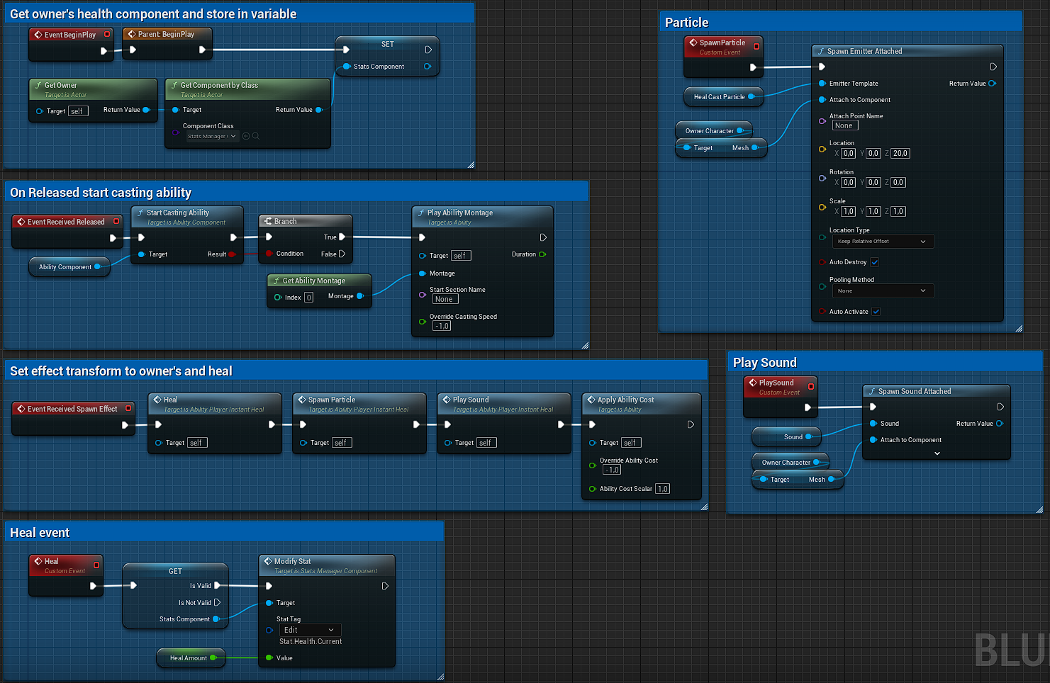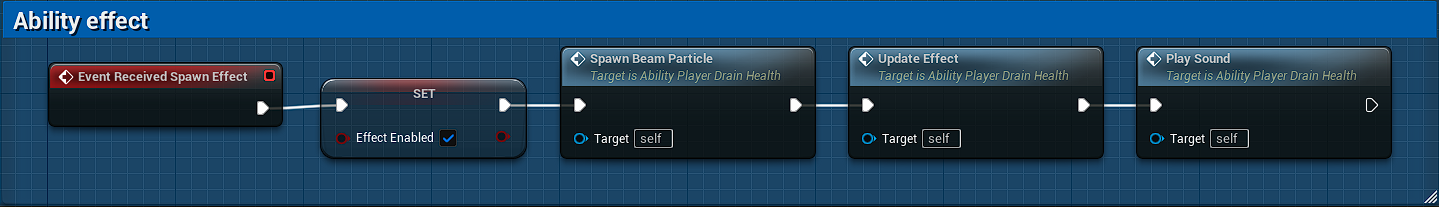 AbilityEffect function in turn is calling ReceivedSpawnEffect function from ability, which heals the owner, spawns particle, plays sound and consumes mana.