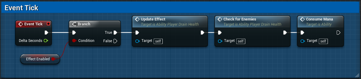 Then Event Tick updates effect (its transform), consumes mana, and checks whether there are any enemies hit by this ability.