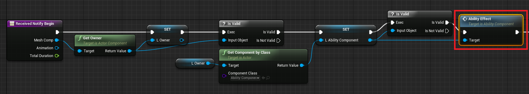 When this notify Begin event is triggered, it calls AbilityEffect function from AbilityComponent.