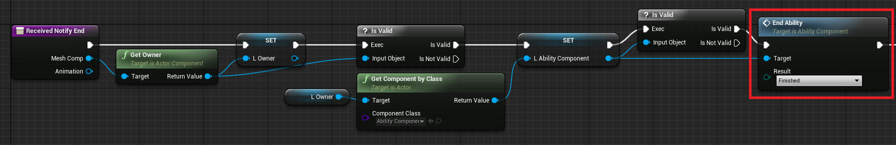 And when End event of notify is triggered, it calls EndAbility function from AbilityComponent which means that ability was successfully finished.