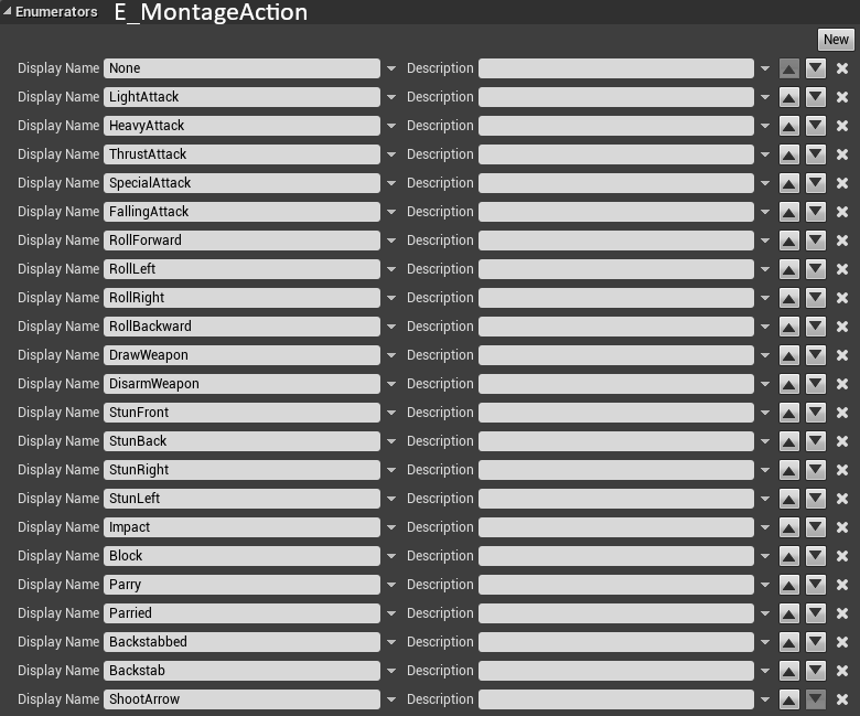 Most of the animation montages like attacks / roll / effects / weapon change etc. are stored in data tables based on struct F_MontageAction.