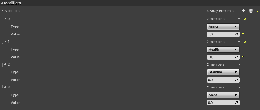 As an example let’s take a look at SteelBoots item blueprint, it has array of modifiers.