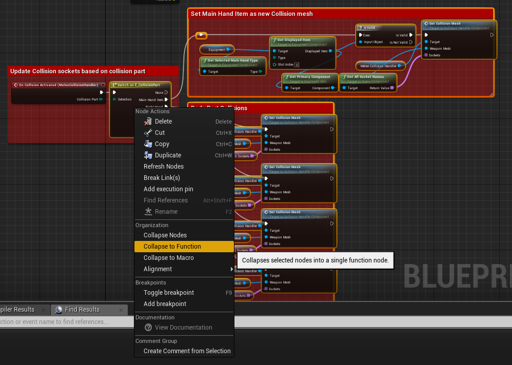 Nodes called on collision activated (from CollisionHandlerComponent) were collapsed to the function called OnCollisionActivated, so it can be easily overriden in child blueprints.